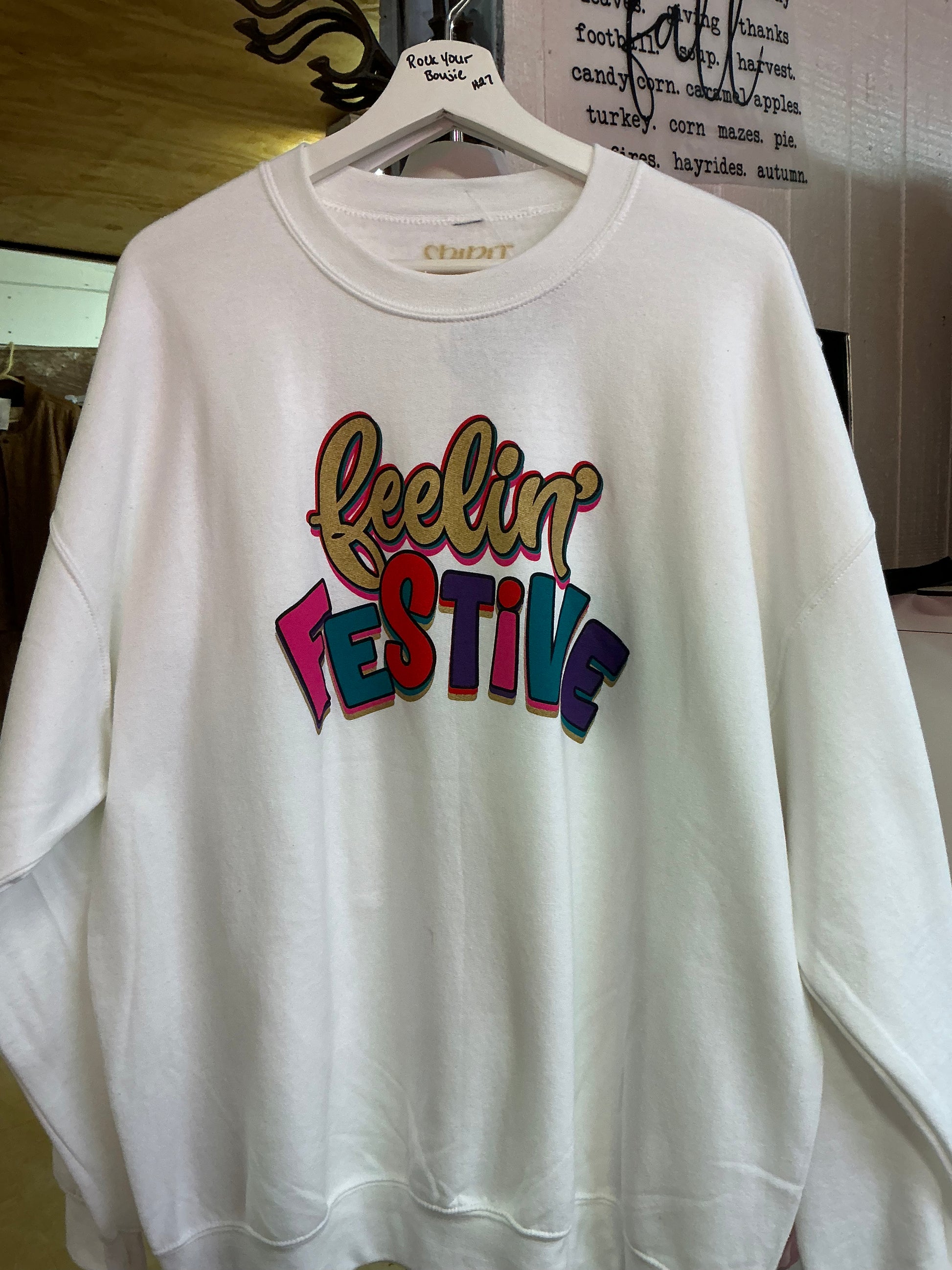 Get into the holiday spirit with this cheerful Feelin’ Festive sweatshirt! 🎄✨