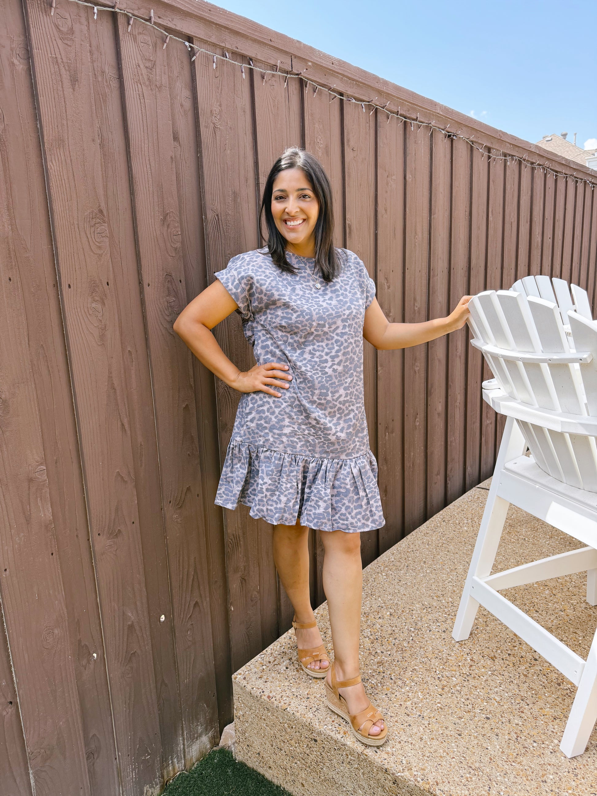 Turn heads in this playful yet polished animal print dress. Designed with a relaxed fit and lightweight fabric, this dress features a subtle leopard pattern for a trendy twist on a classic silhouette. The ruffle hem adds a feminine touch, while the back button detailing gives it an elevated finish. Perfect for brunch dates, backyard parties, or casual outings, this dress pairs effortlessly with sandals or wedges for an easy-chic look.