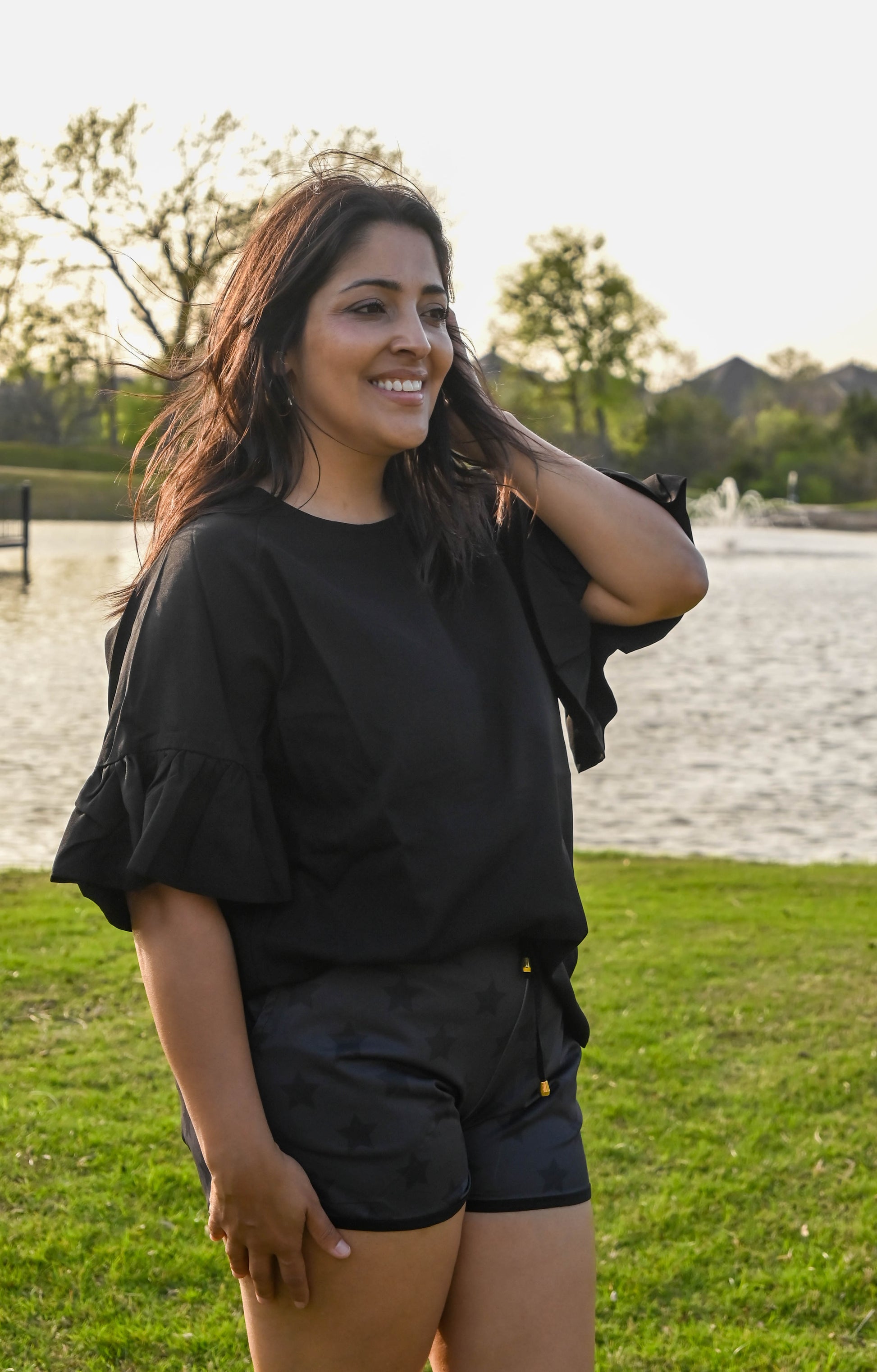 These mid-rise black star print shorts are so perfect for the spring and summer! Get the effortless yet chic look with these shorts. They feature a mid-rise, tie waist drawstring, & side pockets. These are a relaxed fit.